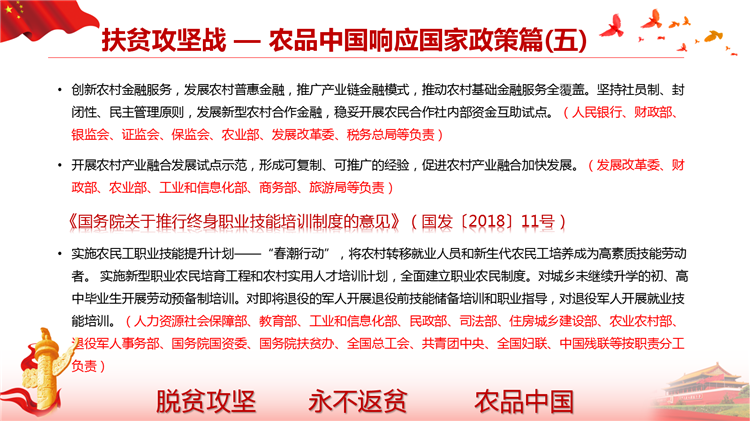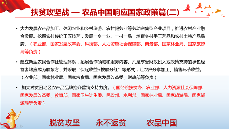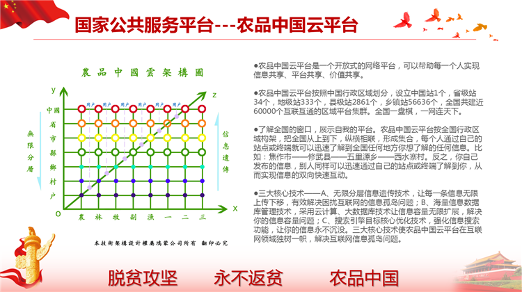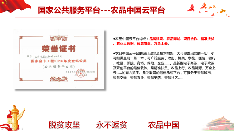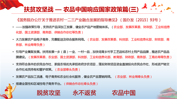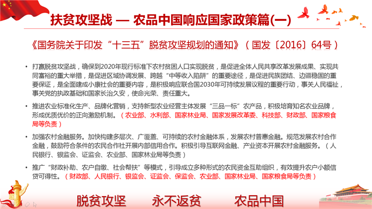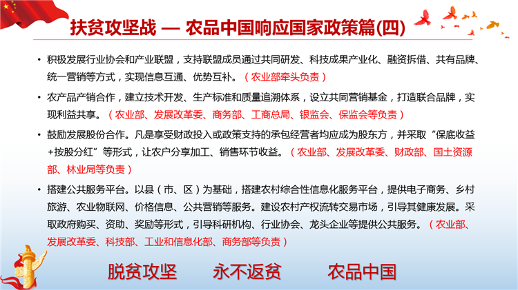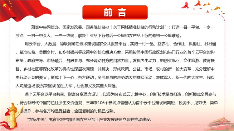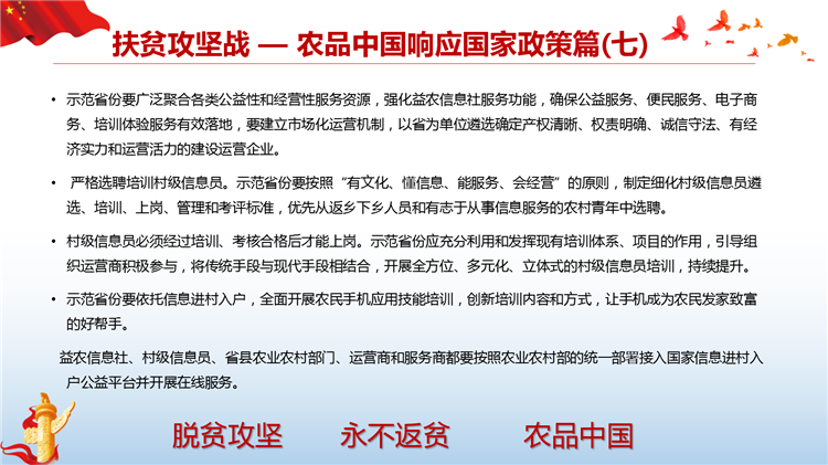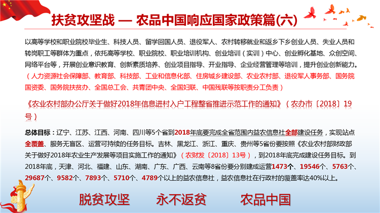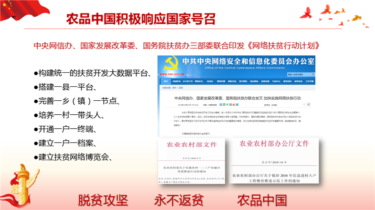 落实国家网信办、扶贫办、发改委《关于网络精准扶贫的行动计划》,打造一县一平台、一乡一节点、一村一带头人、一户一终端、解决工业品下行最后一公里和农产品上行的最初一公里难题。
